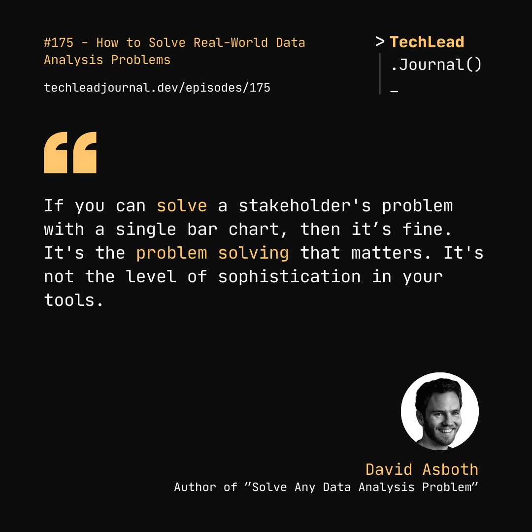 NEW EPISODE #175 David Asboth, author of “Solve Any Data Analysis Problem” and co-host of the “Half Stack Data Science” podcast, shares practical tips for solving real-world data analysis challenges. He highlights the gap between academic training and industry demands, emphasizing the importance of understanding the business problem and maintaining a results-driven approach. David offers practical insights on data dictionary, data modeling, data cleaning, data lake, and prediction analysis. We also explore AI’s impact on data analysis and the importance of critical thinking when leveraging AI solutions. Tune in to level up your skills and become an indispensable, results-driven data analyst. Listen out for: